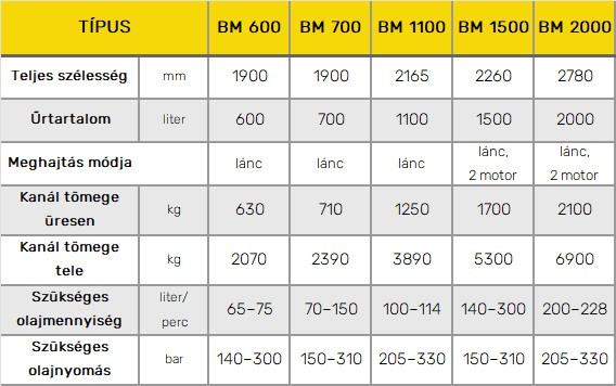 A megfelelő szereléket úgy választhatjuk ki, hogy összehasonlítjuk a gépünk üzemi teherbírását és az alábbi táblázatban a "Kanál tömege tele" sorok értékeit. Az alapgép üzemi teherbírása nagyobb kell legyen, mint a betonnal megtöltött keverőkanál tömege.